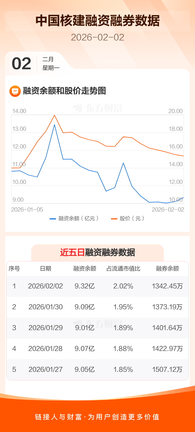 交易所最新数据显示,中国核建于2026年2月2日获融资买入1.24亿元,融资偿还1.02亿元,当日融资净买入2256.29万元。目前,该股融资余额9.32亿,占流通市值比例为2.02%。