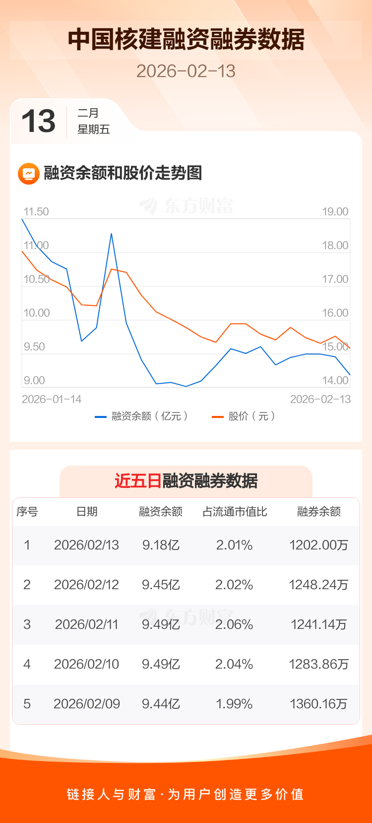 交易所最新数据显示,中国核建于2026年2月13日获融资买入4725.01万元,融资偿还7372.51万元,当日融资净偿还2647.5万元。目前,该股融资余额9.18亿,占流通市值比例为2.01%。