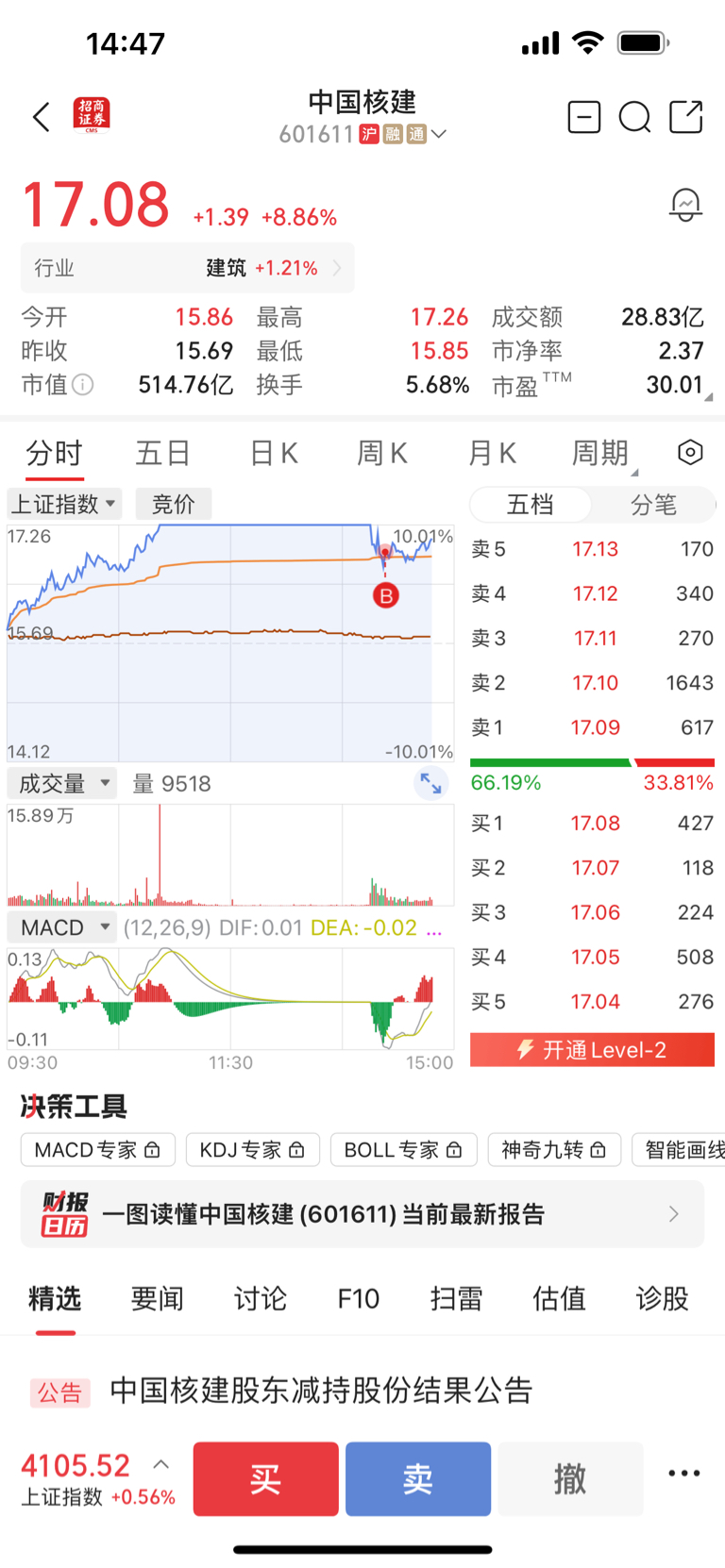 $中国核建(SH601611)$ 16.70进的,赌主力回封板,居然不封,明天还能安全离场么?