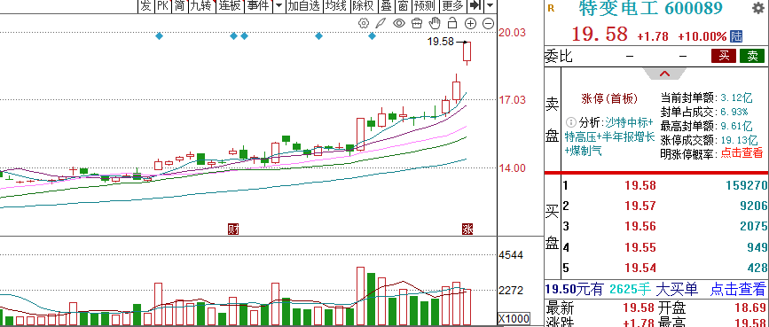 顺利入局,这票的方向是核电核能和黄金概念,公司主营输变电业务、新能源业务、能源业务及新材料业务。是变压器行业龙头,世界领先的新能源系统集成商,为多个核电项目提供变压器等核心设备。今天核电方面走强,是一个助攻方向, 同时光伏跟黄金概念也是加分项,公司的主要产品有变压器及电抗器、电线电缆、多晶硅相关产品、煤炭产品、黄金产品、铝电子新材料和铝及合金制品、电力产品、输变电成套工程、太阳能及风能系统工程等。黄金属性不突出,但这个板块今天15只涨停,特变电工同时站在两个风口上,辨识度也是够显眼的。形态上跟万业企业类似,都是突破了近期新高,却走出截然不同的走势,主要是指分时行情,一个高开低走,一个高开高走,特变电工目前是多头排列结构,在前面启动的行情当中,阳线放量阴线缩量就展示出边洗边拉的意图,今天奋力突破有望切入主升浪行情,另外,风电跟储能板块近来也强势,这票也含有这些属性,关注这些板块的助攻效应跟退潮影响。