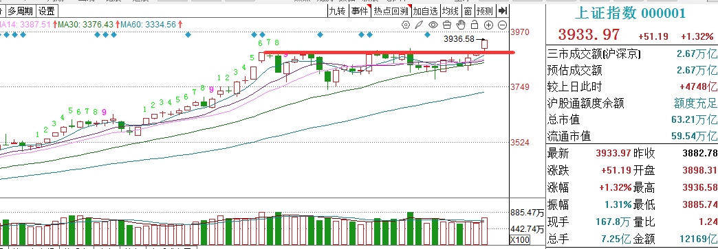 早评还是继续看多今天大的行情,主要逻辑是节日期间外围市场都是走新高,纳指和日经指数都是历史新高,港股恒生指数在节后也是继续上涨,都是有助于节后市场走强。说白了就是说节后要开启补涨行情,今天四大股指全部高开高走,盘中还出现脉冲,跟咱们的预期完全一致。