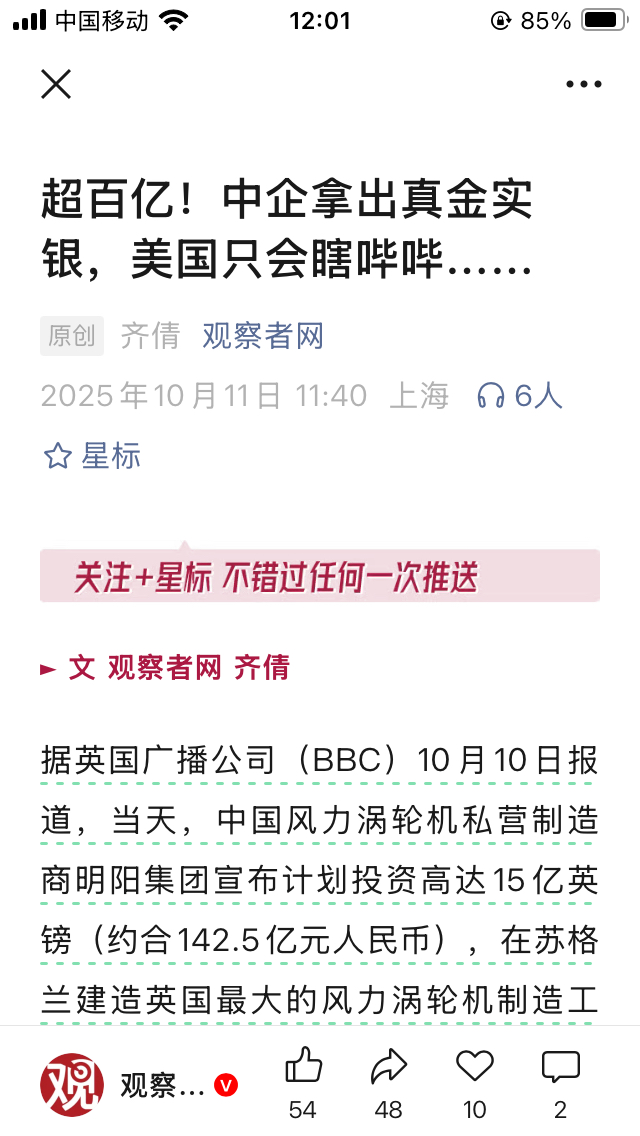 $明阳智能(SH601615)$ 刚刚在观察者网上看到,在英格兰投资 140 亿建风电,厉害了