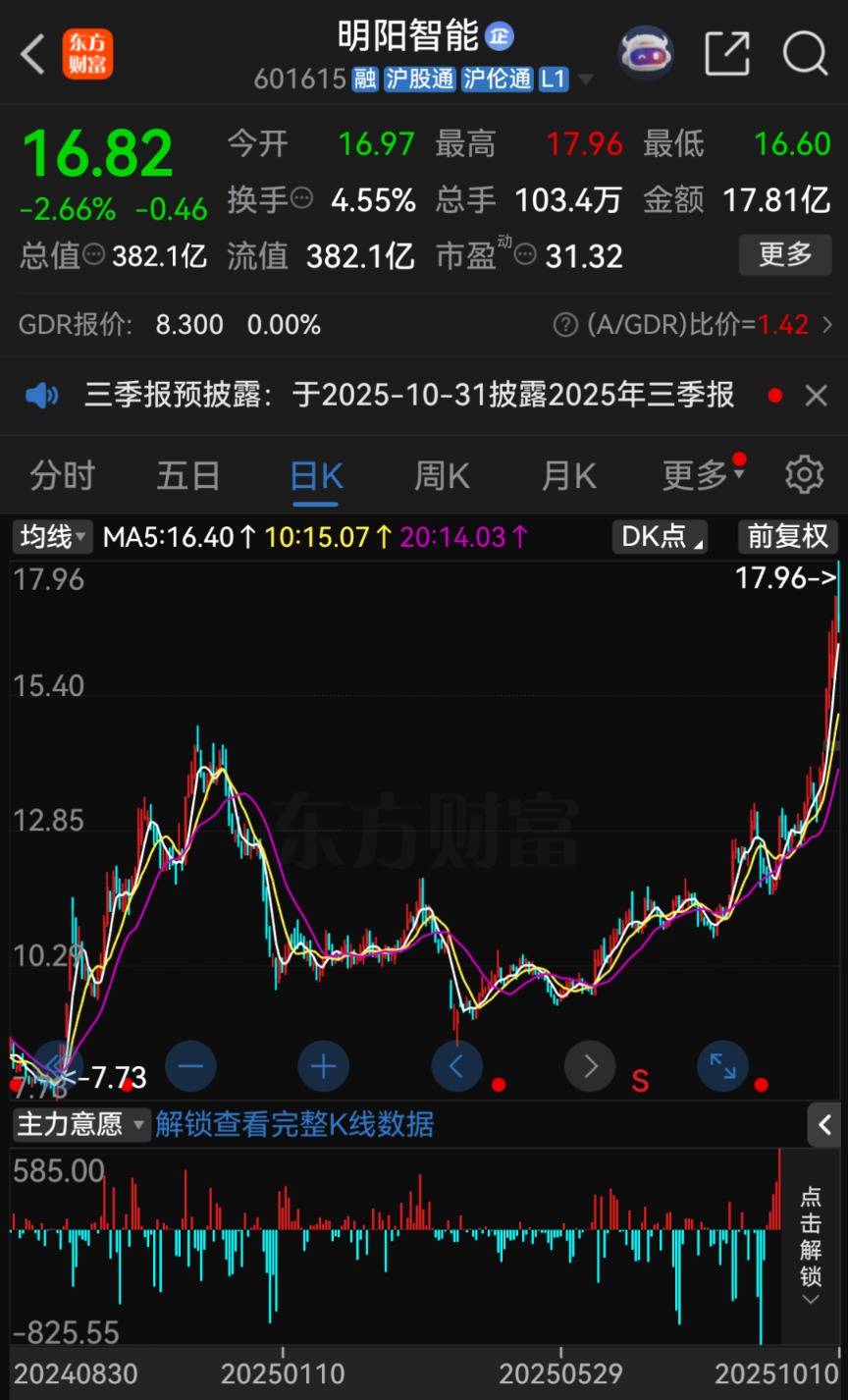截至10月10日收盘,明阳智能股价报16.82元/股,跌幅达2.66%,总市值为382.1亿元。