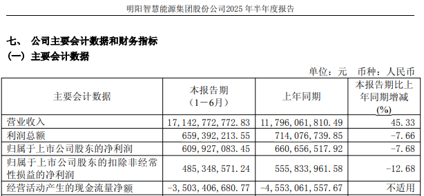 2025年上半年,明阳智能的营业收入同比增长45.33%至171.43亿元,归母净利润同比下降7.68%至6.10亿元,扣非后净利润同比下降12.68%至4.85亿元。