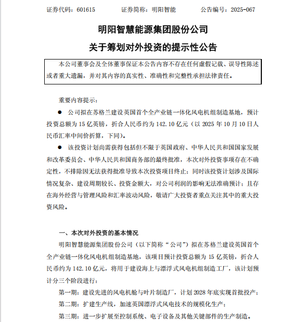 10月12日晚间,明阳智能公告称,公司拟在苏格兰建设英国首个全产业链一体化风电机组制造基地,预计投资总额15亿英镑,折合人民币约142.10亿元。