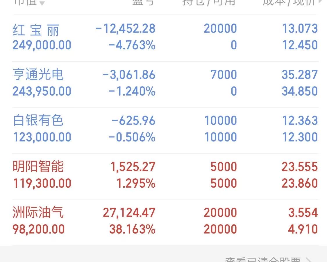 $明阳智能(SH601615)$ 有色金属这一波把石油和化工全部带崩了,新进了两个仓,尾盘有点拉胯,但按技术指标来看还是很稳的。$白银有色(SH601212)$ 开始自动扣钱了。$洲际油气(SH600759)$ 仓位留多了,直接不让走。