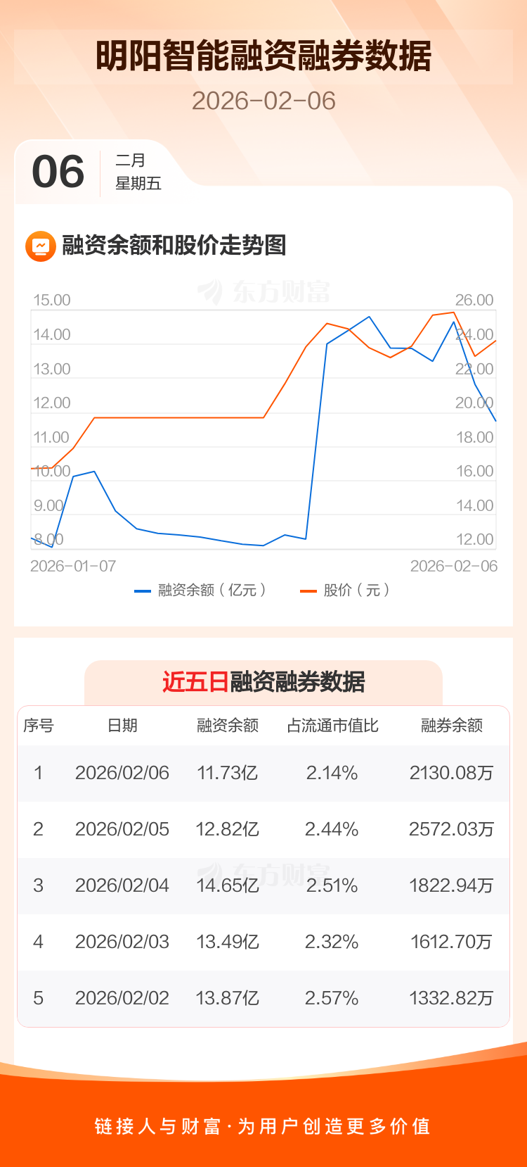 交易所最新数据显示,明阳智能于2026年2月6日获融资买入2.89亿元,融资偿还3.99亿元,当日融资净偿还1.1亿元。目前,该股融资余额11.73亿,占流通市值比例为2.14%。