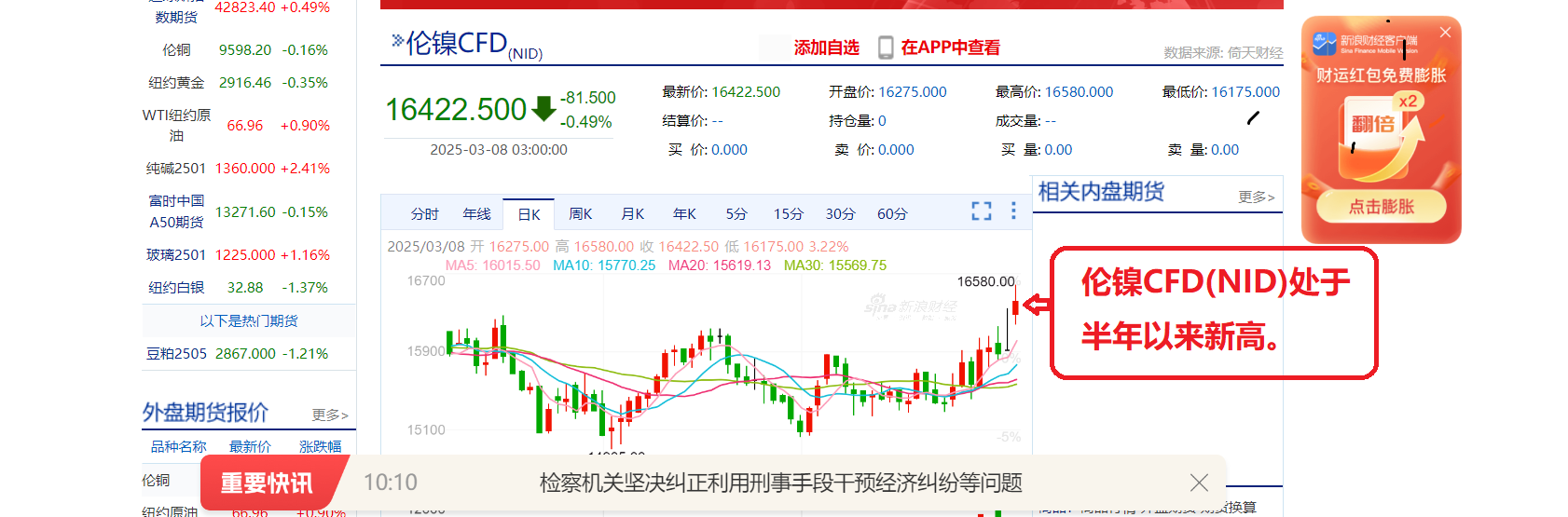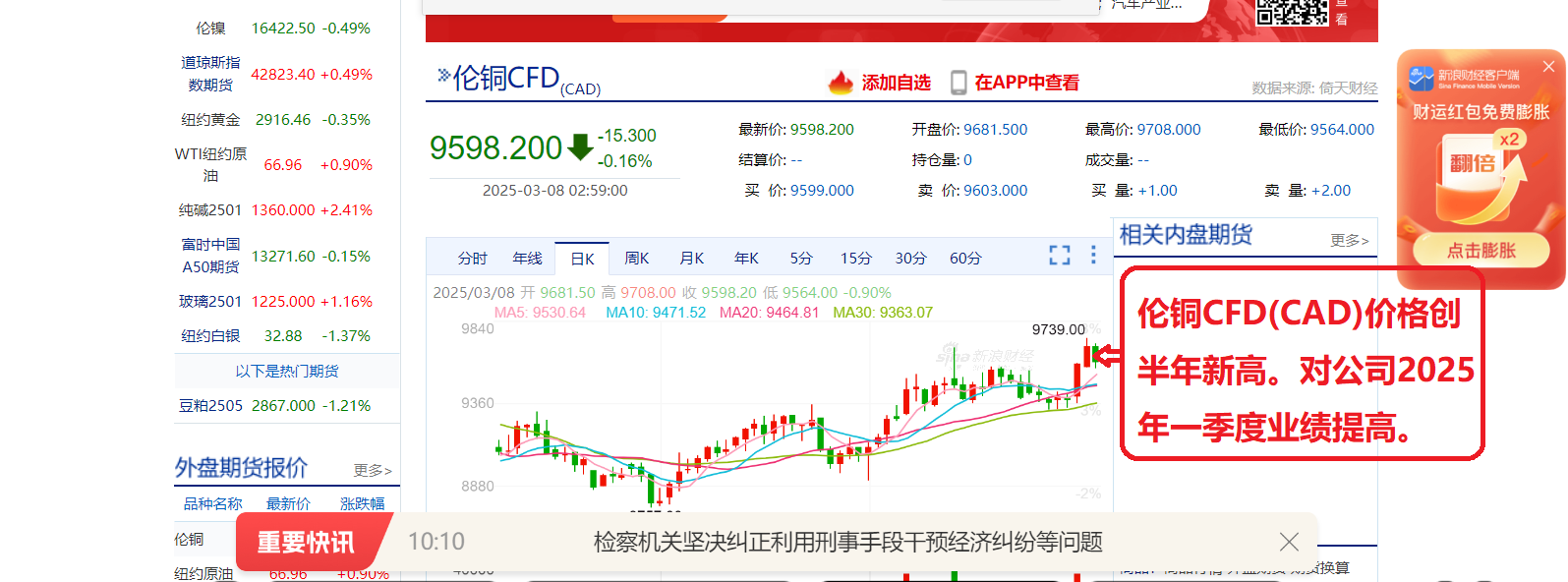 伦铜CFD(CAD)、伦镍CFD(NID):价格创半年新高。对公司2025年一季度业绩提高。