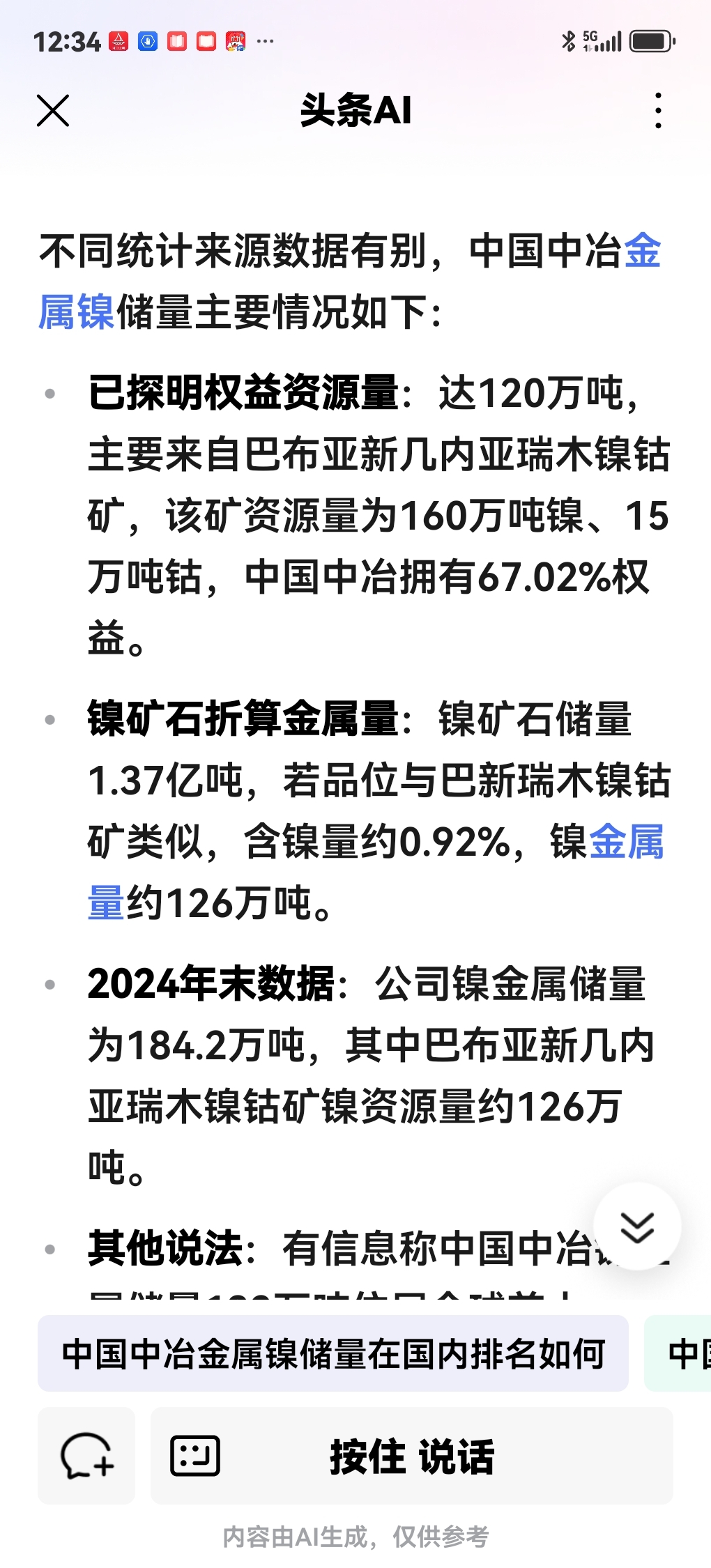 $中国中冶(SH601618)$ 中国中冶,金属镍储量180万吨