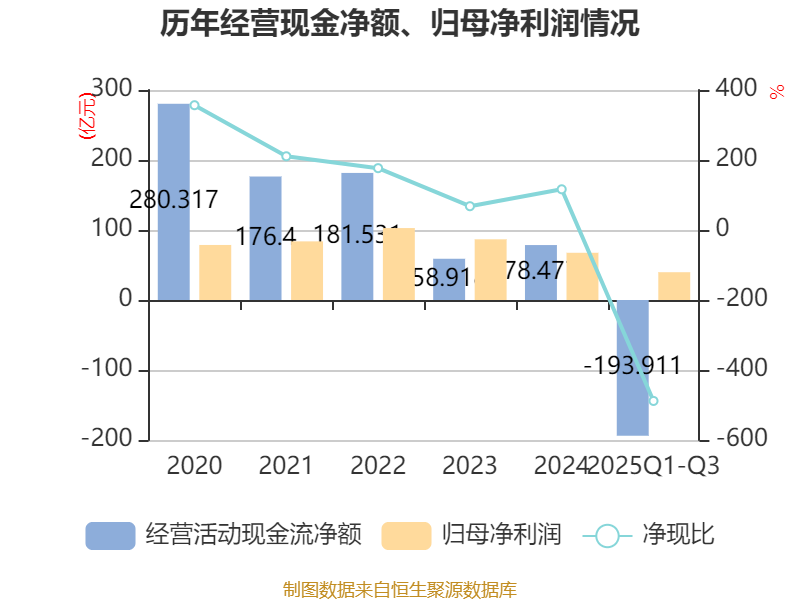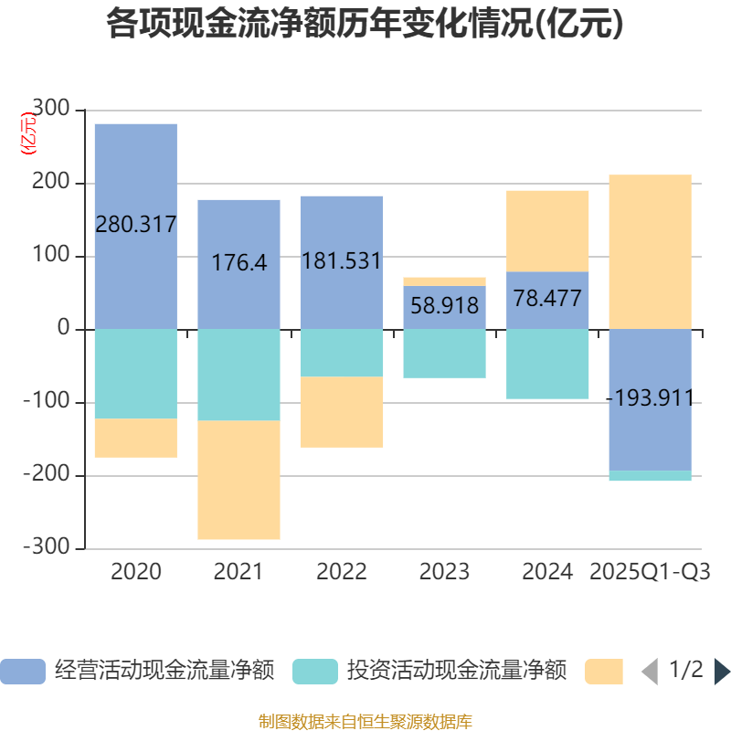 2025年前三季度,公司经营活动现金流净额为-193.91亿元,同比增加113.45亿元;筹资活动现金流净额211.03亿元,同比减少44.59亿元;投资活动现金流净额-13.75亿元,上年同期为-29.56亿元。
