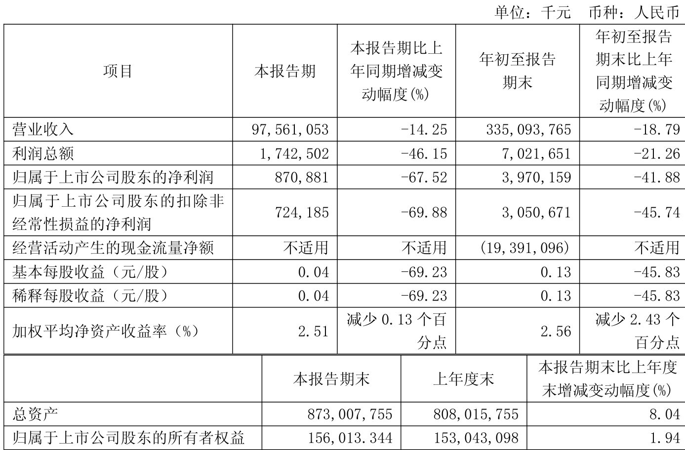中证智能财讯中国中冶(601618)10月31日披露2025年第三季度报告。前三季度公司实现营业总收入3350.94亿元,同比下降18.79%;归母净利润39.7亿元,同比下降41.88%;扣非净利润30.51亿元,同比下降45.74%;经营活动产生的现金流量净额为-193.91亿元,上年同期为-307.36亿元;报告期内,中国中冶基本每股收益为0.13元,加权平均净资产收益率为2.56%。