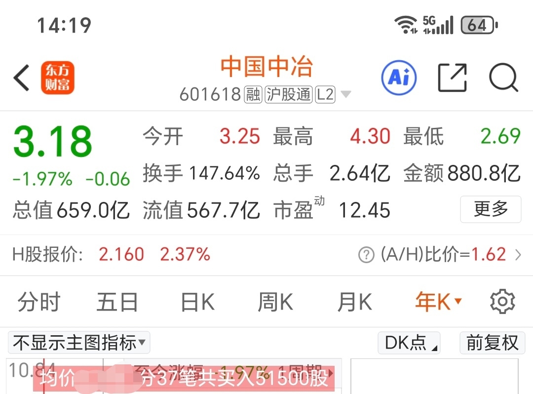 $中国中冶(SH601618)$ 这个股票真的伤我的心,我从四块钱一路买下来,它就从四块钱一路跌下来,不知不觉的我已经买了五万多股了,想当初在四块钱买五万股,得花二十多万,唉。今年是彻底整无语了