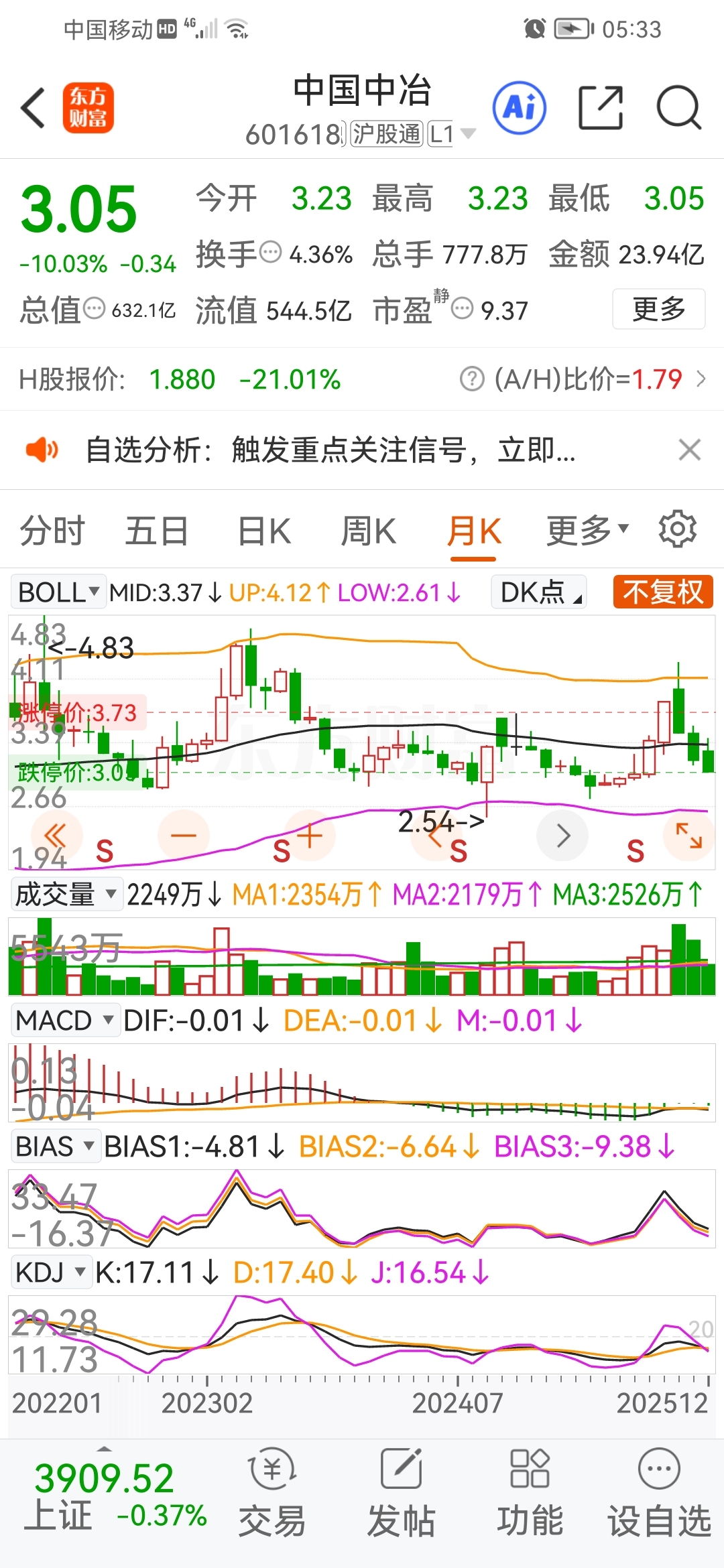 $中国中冶(SH601618)$ #复盘记录# 月线下轨2.61买入