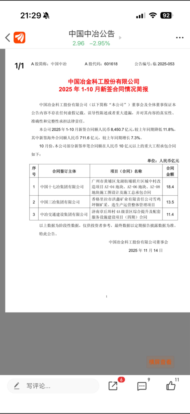 $中国中冶(SH601618)$ 有点过于悲观了,本身艾娜克矿就处于想象力阶段,这么多矿的产出就占6、7%的利润。就算矿没了,也有矿山基建、服务业务,比如他11.15的公告就有个雪鸡坪铜矿采、选生产运营整体管理项目,合同金额13.5亿元。就把他当成核电里的中国核建,石油天然气里的油服,炒金属的时候也会炒他不就行了吗