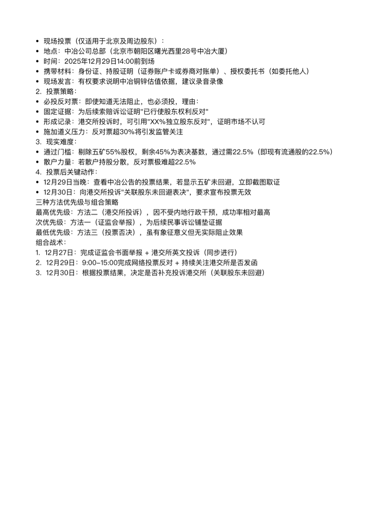 •  12月29日当晚:查看中冶公告的投票结果,若显示五矿未回避,立即截图取证