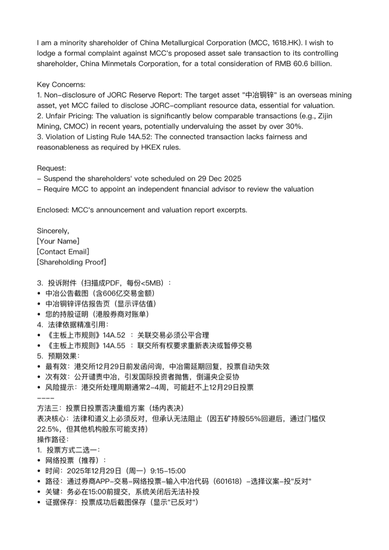 I am a minority shareholder of China Metallurgical Corporation (MCC, 1618.HK). I wish to lodge a formal complaint against MCC's proposed asset sale transaction to its controlling shareholder, China Minmetals Corporation, for a total consideration of RMB 60.6 billion.