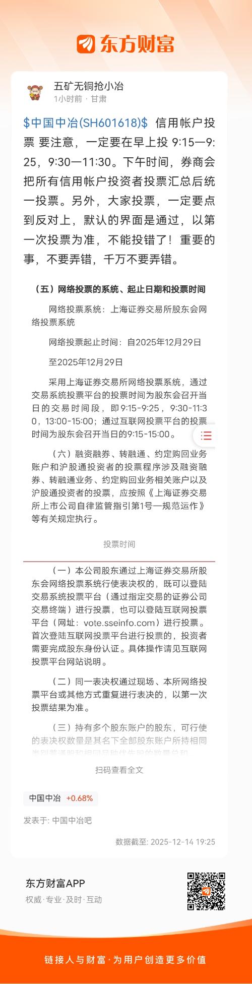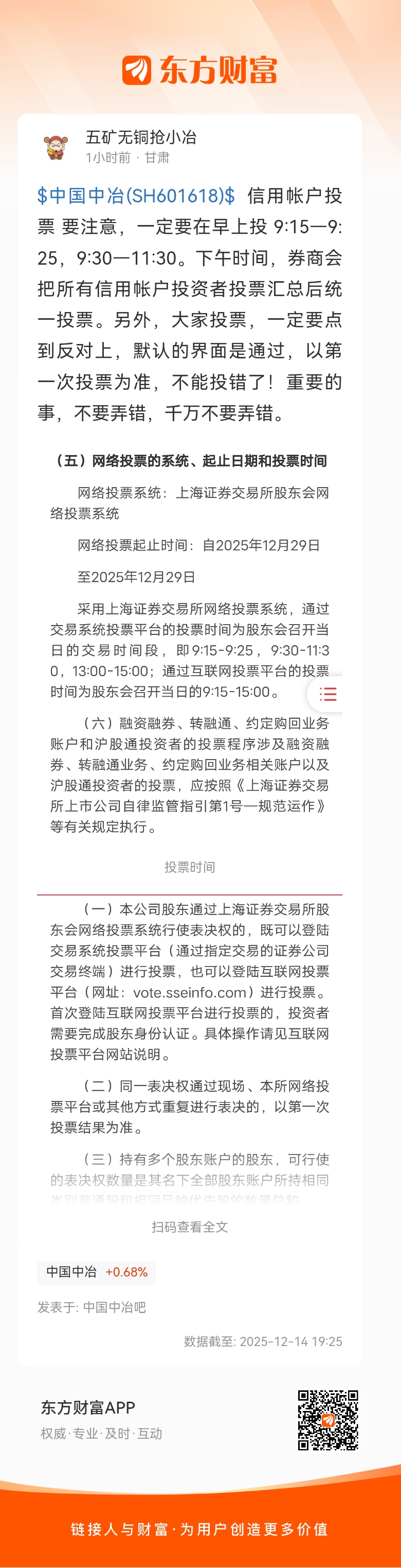 $中国中冶(SH601618)$ 信用帐户投票 要注意,一定要在早上投 9:15—9:25,9:30—11:30。下午时间,券商会把所有信用帐户投资者投票汇总后统一投票。另外,大家投票,一定要点到反对上,默认的界面是通过,以第一次投票为准,不能投错了!重要的事,不要弄错,千万不要弄错。