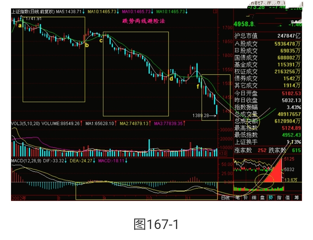$中国中冶(SH601618)$ 跌势两线避险法: 我们讲述一下,它就是:5日、10日均价线死亡交叉,一旦死亡交叉坚决不操作,一直到黄金交叉为止。如果这样操作,从图中1741点跌到下面这1400点的一波大跌幅中,我们至少大部分时间不操作,避免了a-b区间、c-d区间、f区间的下跌,因为5、10日均线都是死亡交叉,这就是【跌势两线避险法】。