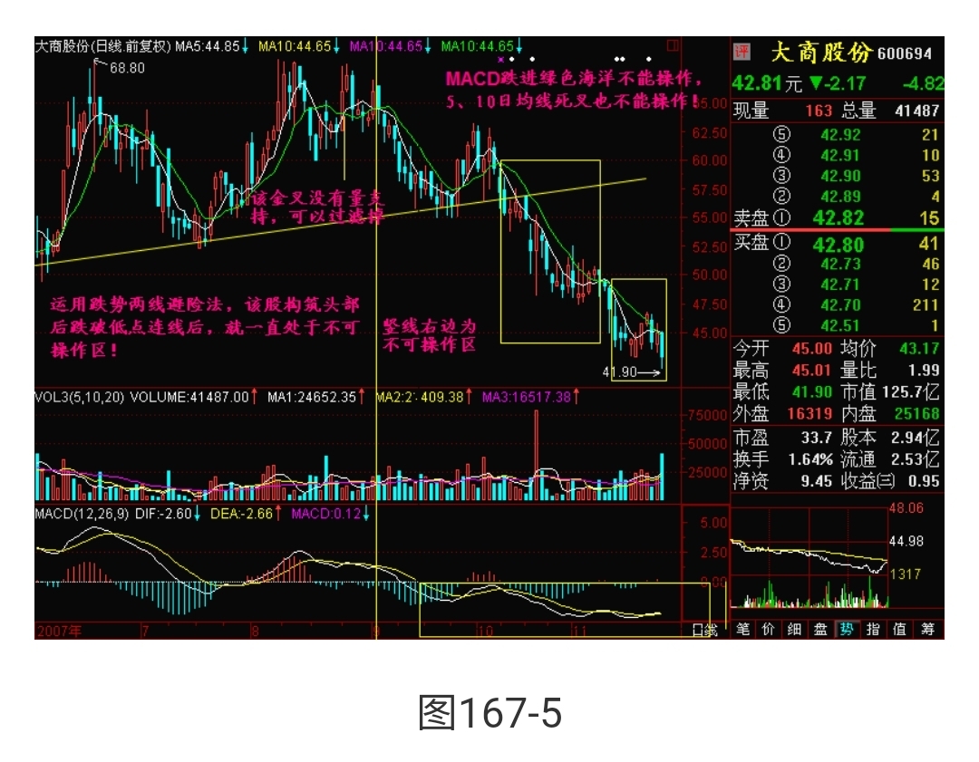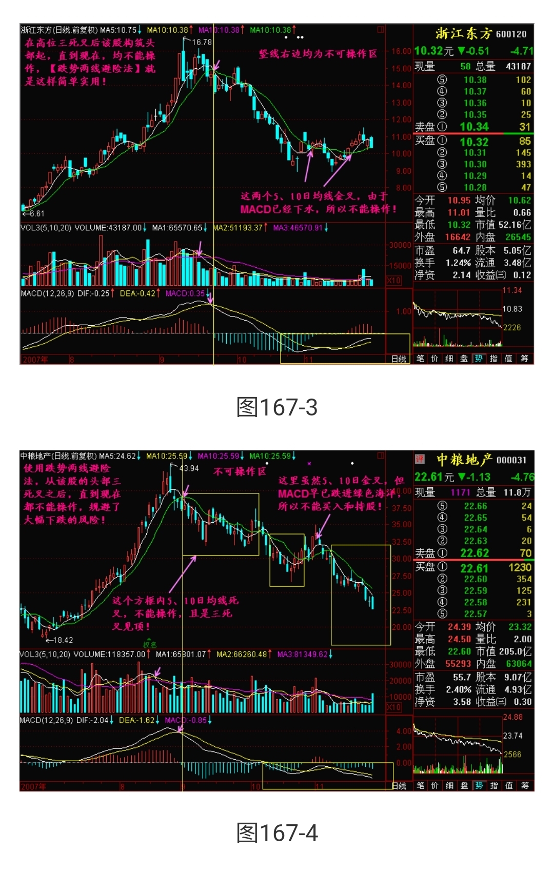 跌势两线避险法:我们讲述一下,它就是:5日、10日均价线死亡交叉,一旦死亡交叉坚