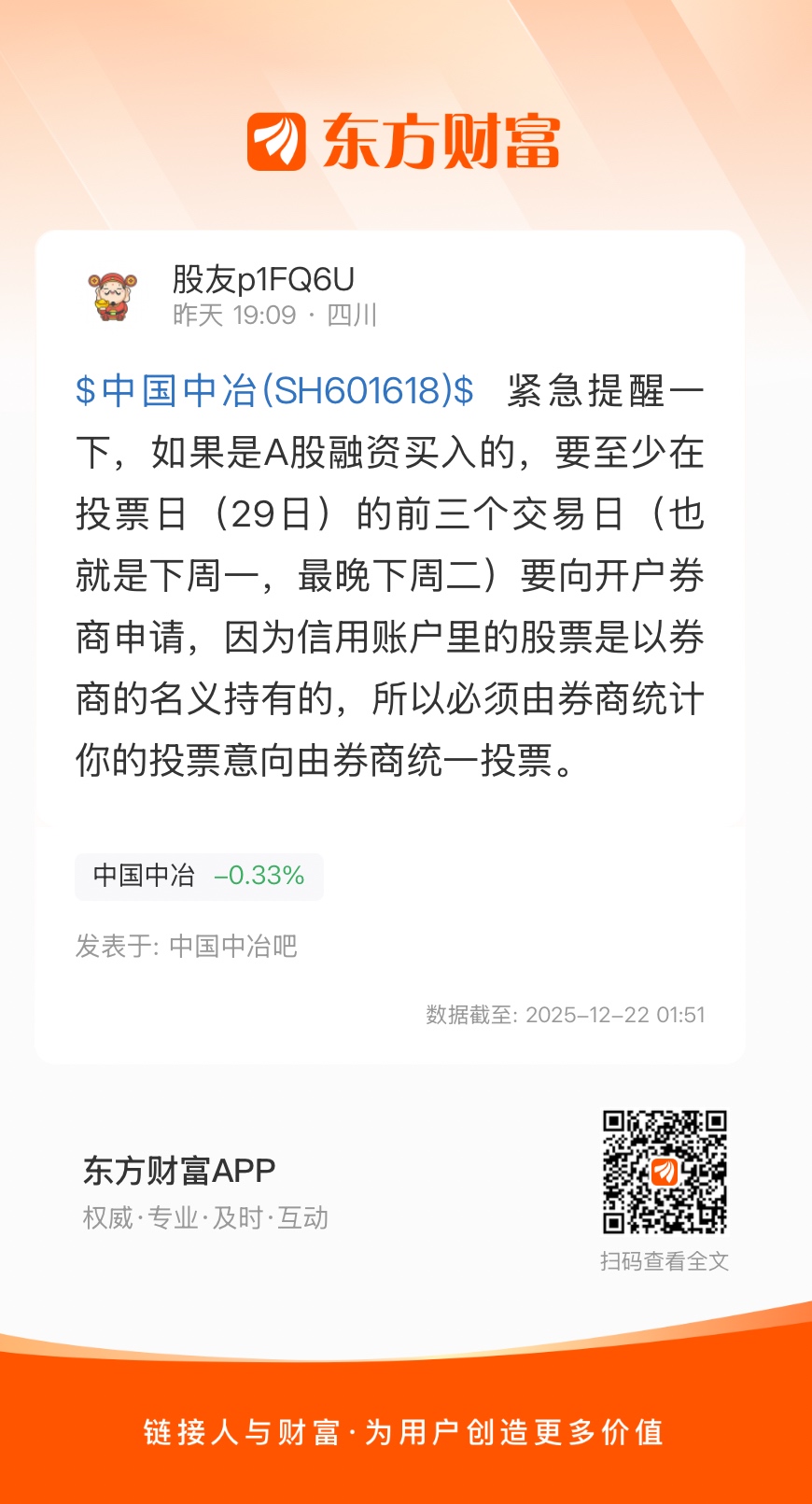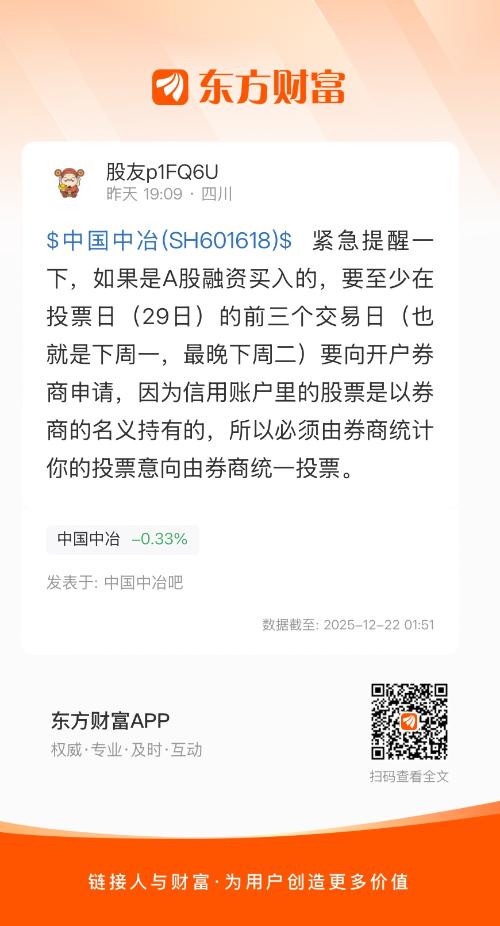 $中国中冶(SH601618)$ 紧急提醒一下,如果是A股融资买入的,要至少在投票日(29日)的前三个交易日(也就是下周一,最晚下周二)要向开户券商申请,因为信用账户里的股票是以券商的名义持有的,所以必须由券商统计你的投票意向由券商统一投票。