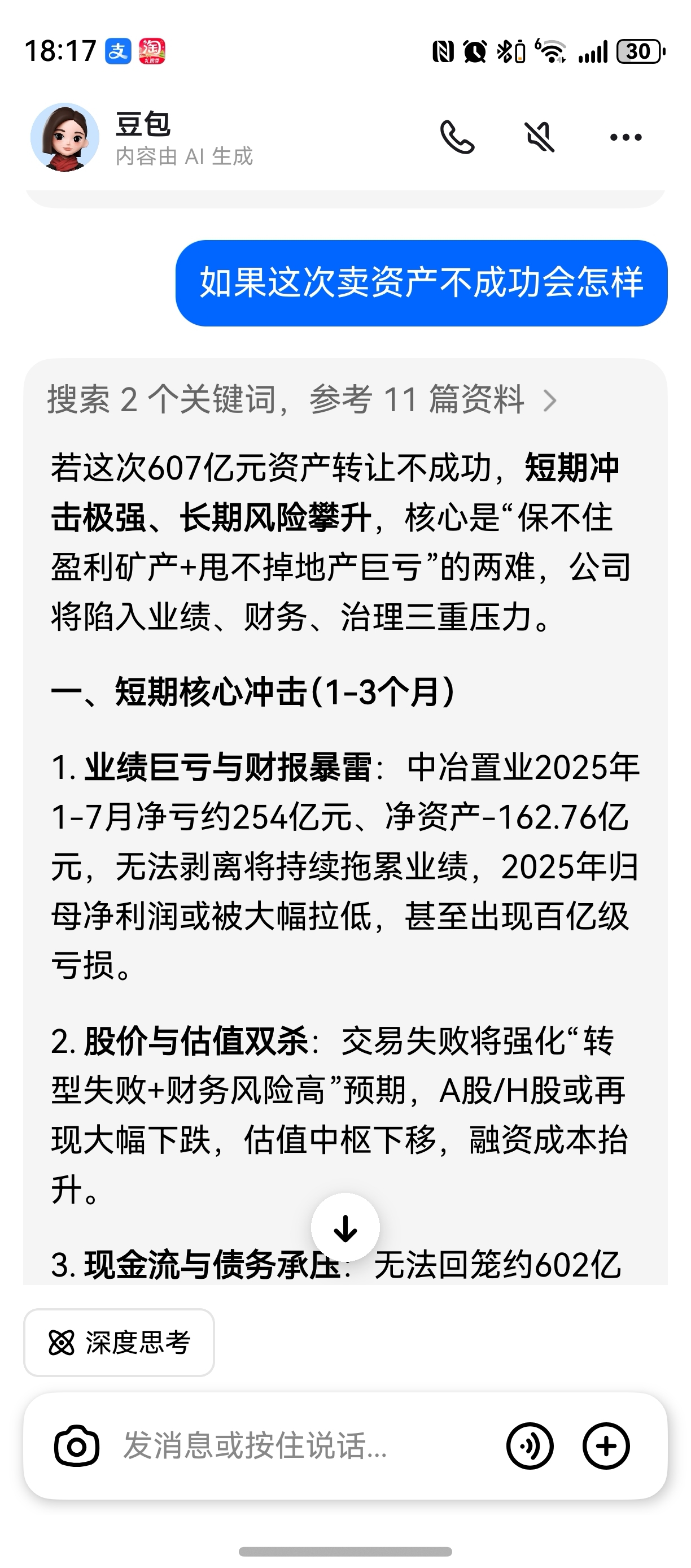 $中国中冶(SH601618)$ 问了豆包,说是资产转让不成功,短期股价还要下跌。