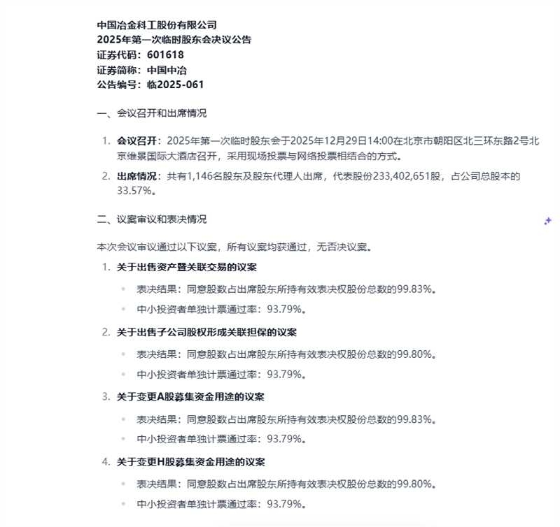 $中国中冶(SH601618)$ 别等了,四个议案全部通过,通过率93.79%