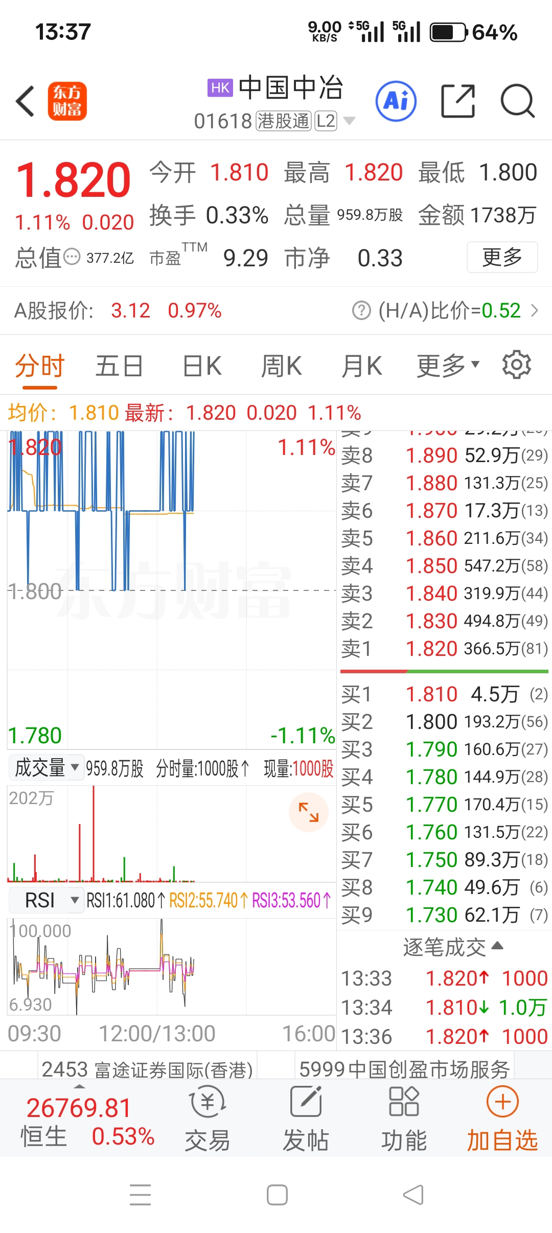 $中国中冶(SH601618)$ 港股这成交量,没有玩的了