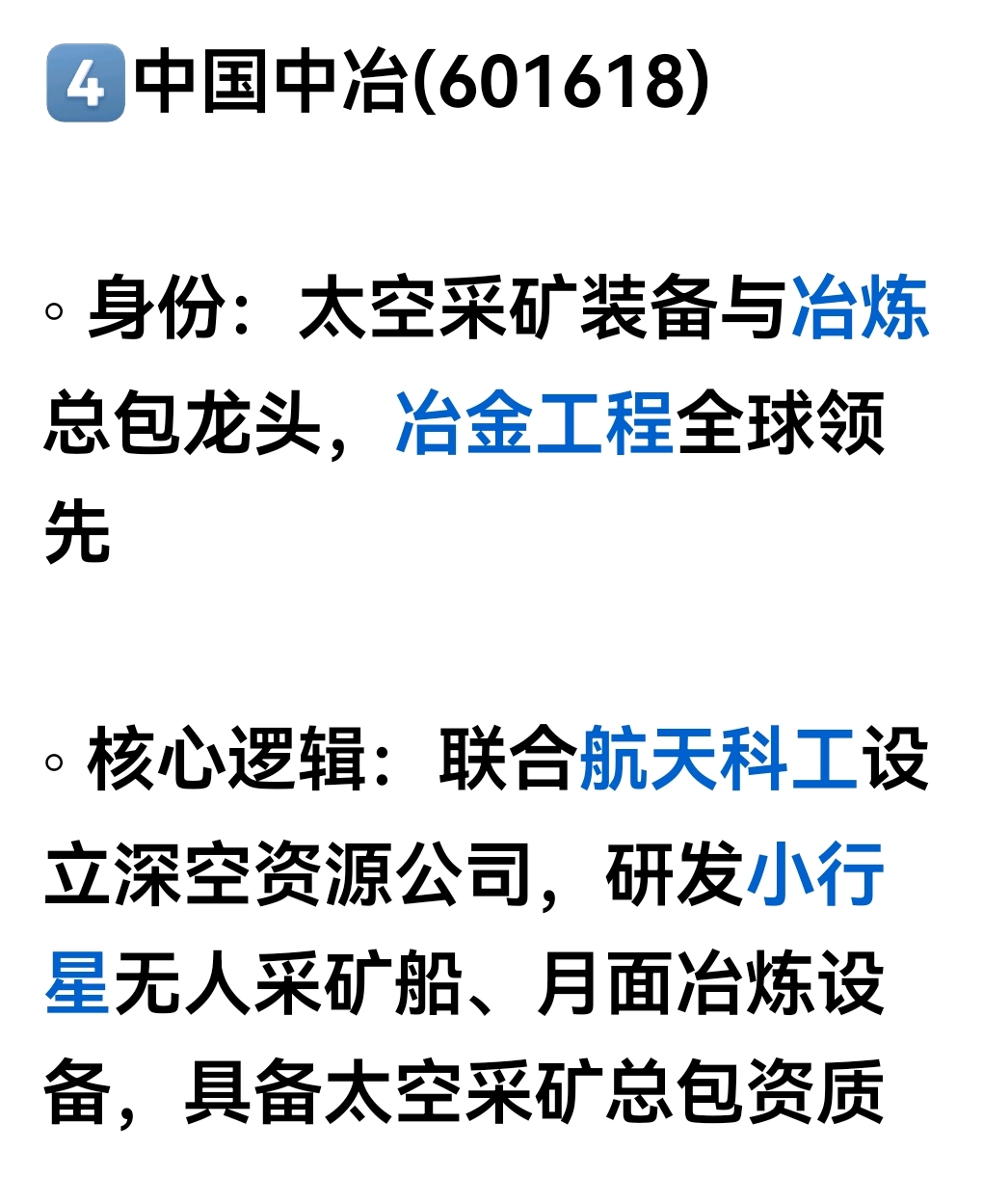 $中国中冶(SH601618)$ 天工开物(太空资源开发/太空采矿)概念龙头