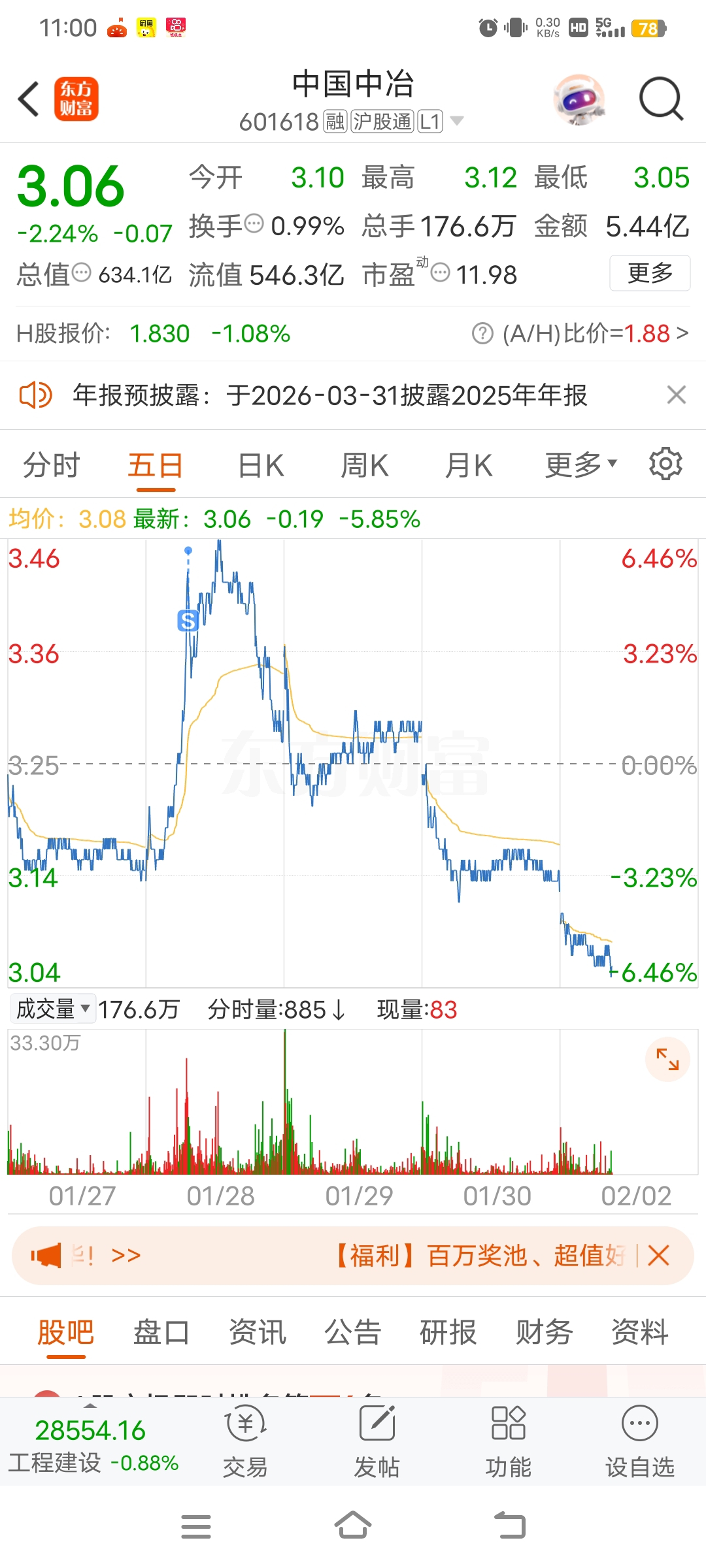 $中国中冶(SH601618)$ 3.46跑了,这货得到3以下了,