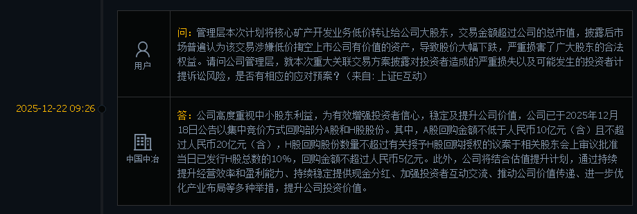 中冶管理层缺德,大股东明着抢矿,给点回购说提升股价,结果股价比回购前还要低。