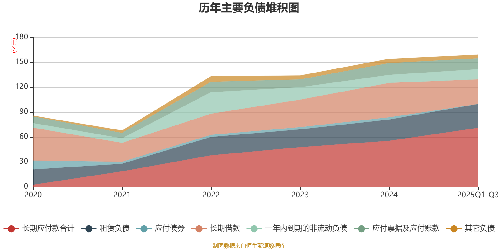 负债重大变化方面,截至2025年三季度末,公司长期借款较上年末减少28.34%,占公司总资产比重下降6.23个百分点;长期应付款合计较上年末增加28.27%,占公司总资产比重上升4.78个百分点;应付债券较上年末减少100%,占公司总资产比重下降1.24个百分点;应付票据及应付账款较上年末减少7.05%,占公司总资产比重下降0.87个百分点。