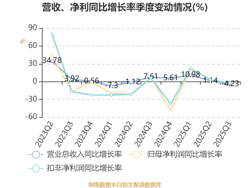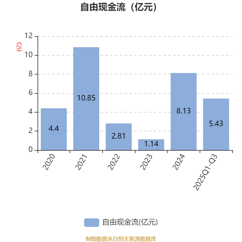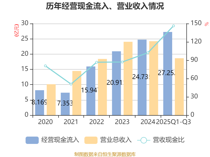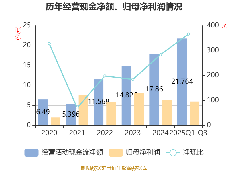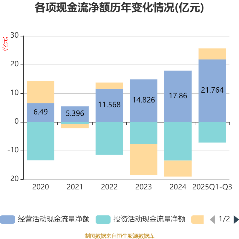 2025年前三季度,公司经营活动现金流净额为21.76亿元,同比增长80.1%;筹资活动现金流净额3.84亿元,同比增加5.99亿元;投资活动现金流净额-7.21亿元,上年同期为-9.61亿元。
