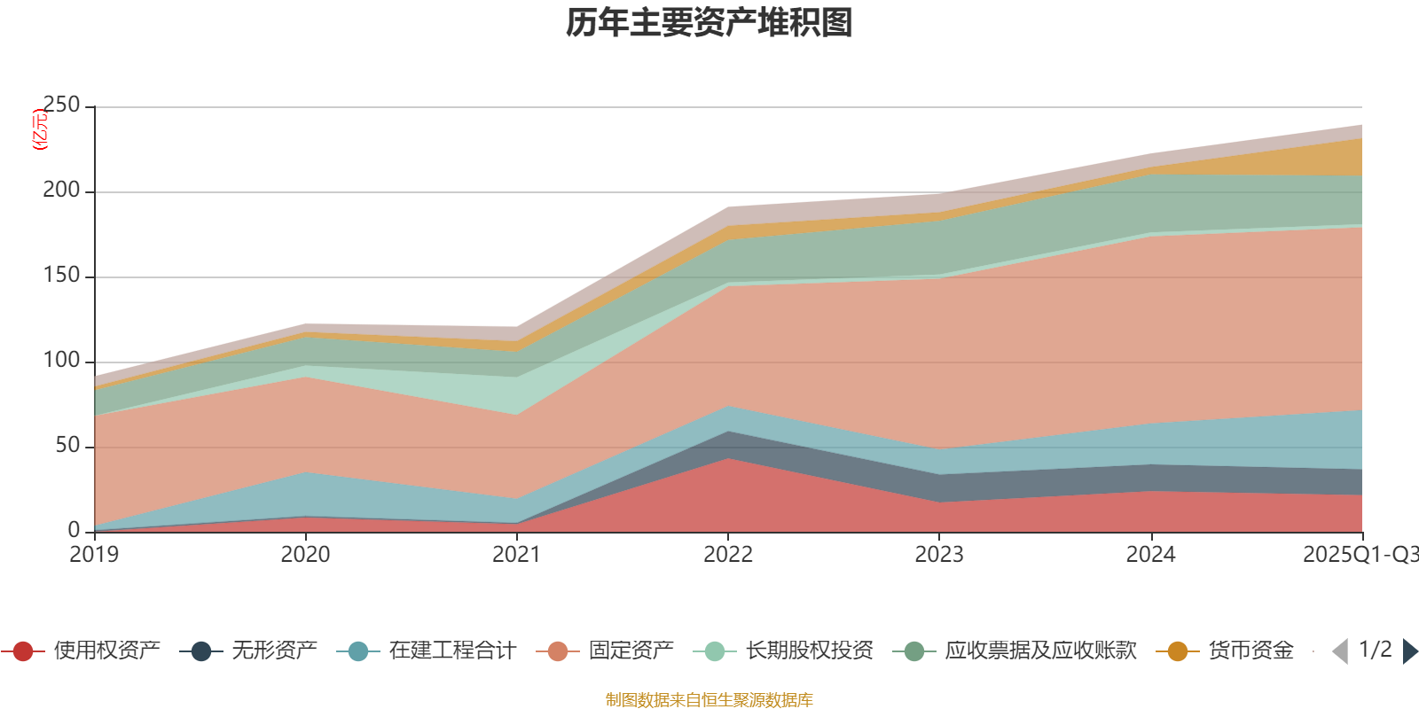 资产重大变化方面,截至2025年三季度末,公司货币资金较上年末增加421.51%,占公司总资产比重上升7.31个百分点;固定资产较上年末减少2.23%,占公司总资产比重下降4.52个百分点;在建工程合计较上年末增加44.12%,占公司总资产比重上升3.69个百分点;应收票据及应收账款较上年末减少16.45%,占公司总资产比重下降3.44个百分点。