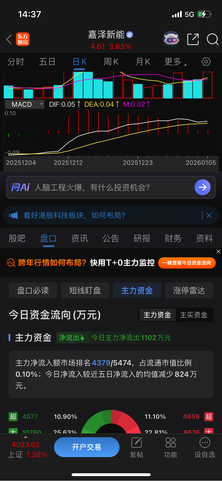 $嘉泽新能(SH601619)$ 主力流出1千多万,清仓