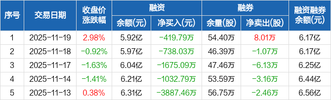 融资方面,当日融资买入5545.06万元,融资偿还5964.85万元,融资净偿还419.79万元,连续5日净偿还累计7753.16万元。融券方面,融券卖出8.85万股,融券偿还8400股,融券余量54.4万股,融券余额2409.96万元。融资融券余额合计6.17亿元。