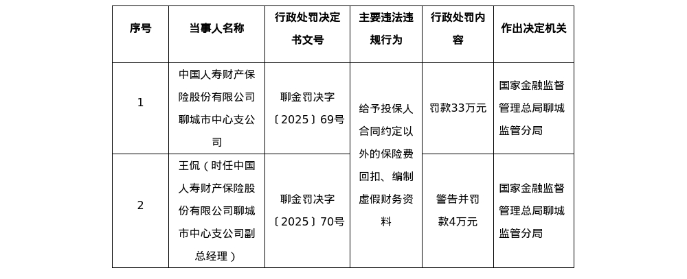 人寿财险聊城中支被罚33万 责任人被罚4万
