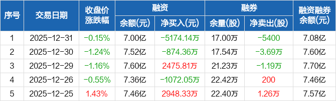 中国人寿:融资净偿还5174.14万元,融资余额7亿元(12-31)