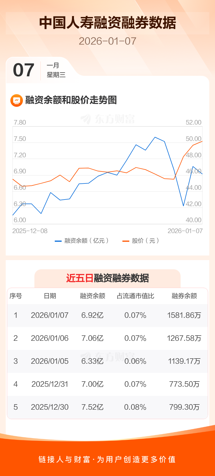 交易所最新数据显示,中国人寿于2026年1月7日获融资买入7476.36万元,融资偿还8868.63万元,当日融资净偿还1392.28万元。目前,该股融资余额6.92亿,占流通市值比例为0.07%。