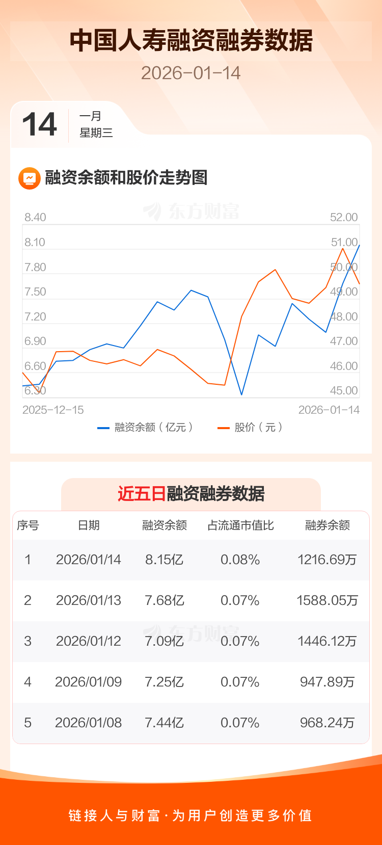 交易所最新数据显示,中国人寿于2026年1月14日获融资买入1.26亿元,融资偿还7924.35万元,当日融资净买入4632.15万元。目前,该股融资余额8.15亿,占流通市值比例为0.08%。