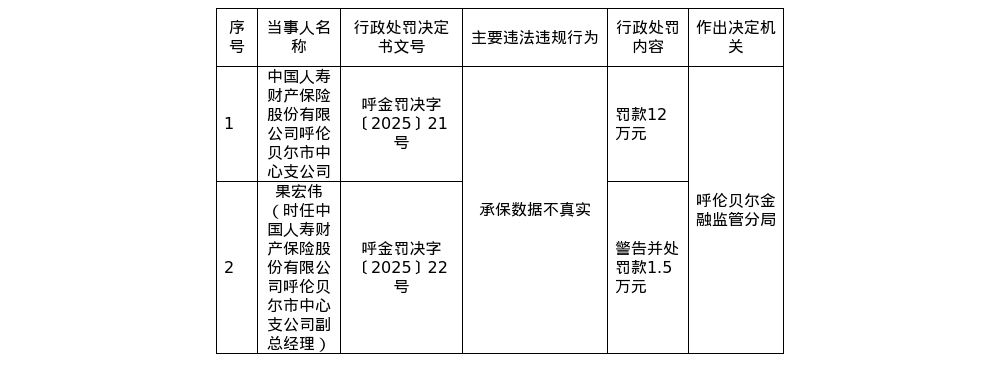 罚单显示,中国人寿财产保险股份有限公司呼伦贝尔市中心支公司的主要违法违规事实(案由)为:承保数据不真实。