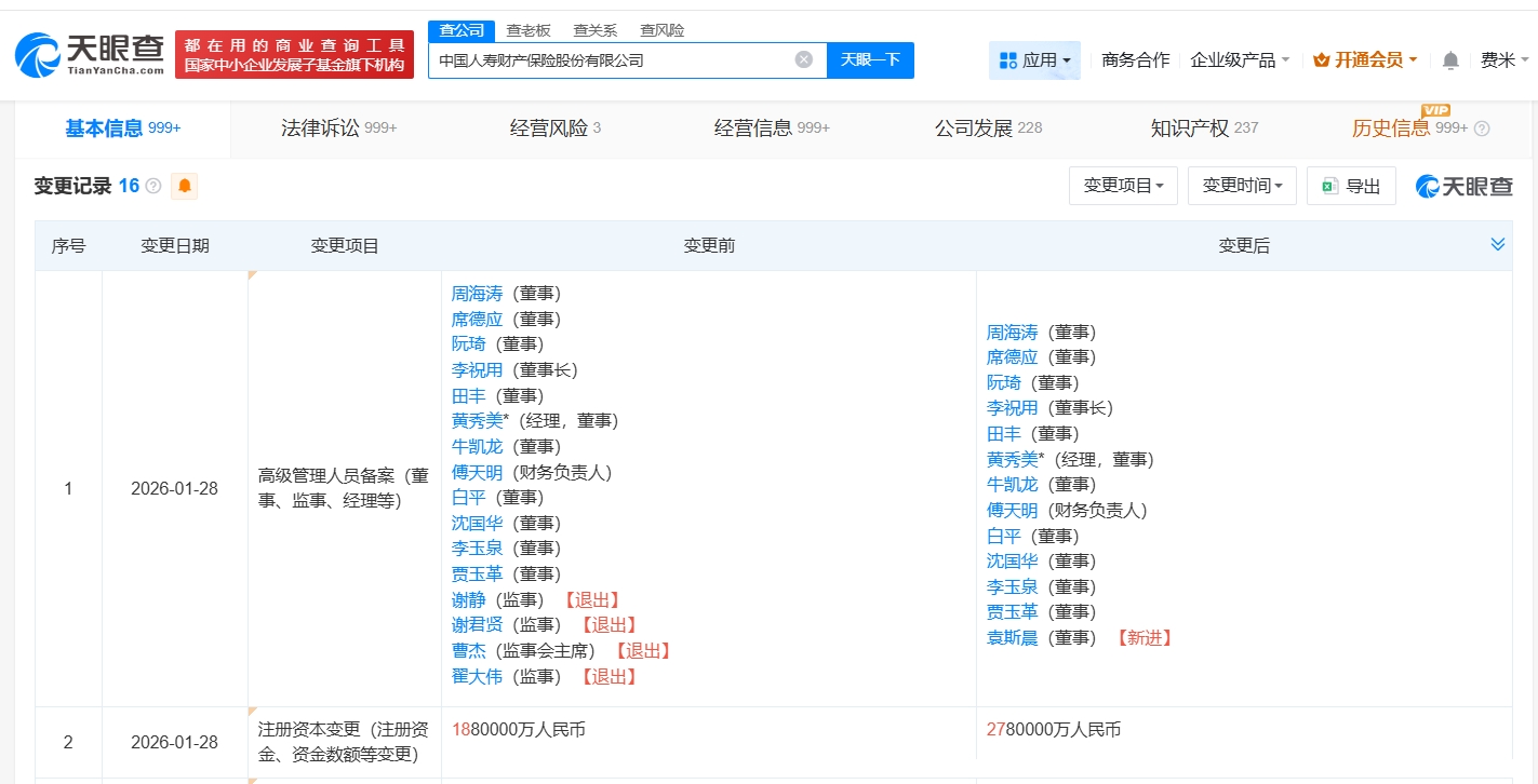 南方财经1月30日电,天眼查工商信息显示,近日,中国人寿财产保险股份有限公司发生工商变更,注册资本由188亿人民币增至278亿人民币,增幅约48%,同时,多位主要人员发生变更。中国人寿财产保险股份有限公司成立于2006年12月,法定代表人为黄秀美,经营范围包括财产损失保险、责任保险、信用保险和保证保险等。股东信息显示,该公司由中国人寿保险(集团)公司、中国人寿保险股份有限公司共同持股。