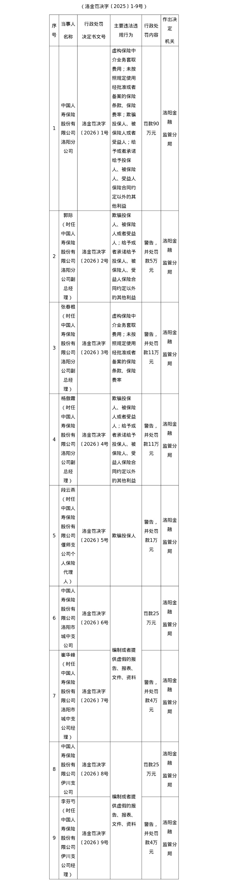 蓝鲸新闻1月30日讯,近日,国家金融监督管理总局洛阳监管分局发布罚单,剑指中国人寿保险股份有限公司洛阳分公司、洛阳市城中支公司、伊川支公司及其相关责任人。