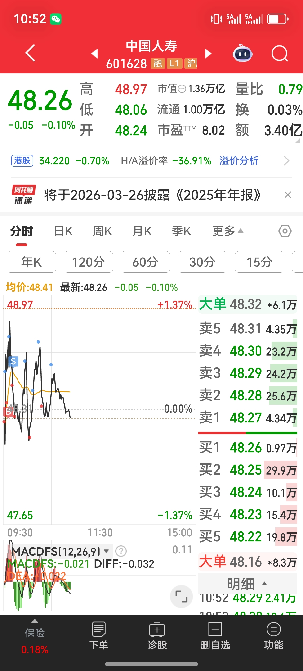 $中国人寿(SH601628)$ 还有1000股可以t,今天就下班了,你咋不上串下跳了呢,整的我都不敢进了