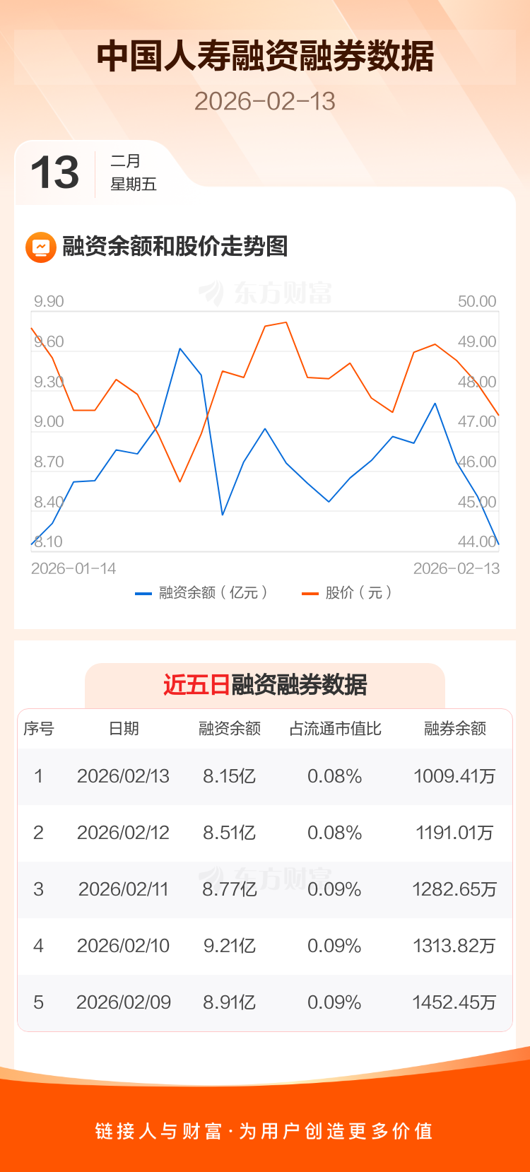 交易所最新数据显示,中国人寿于2026年2月13日获融资买入6579.20万元,融资偿还1.02亿元,当日融资净偿还3627.82万元。目前,该股融资余额8.15亿,占流通市值比例为0.08%。