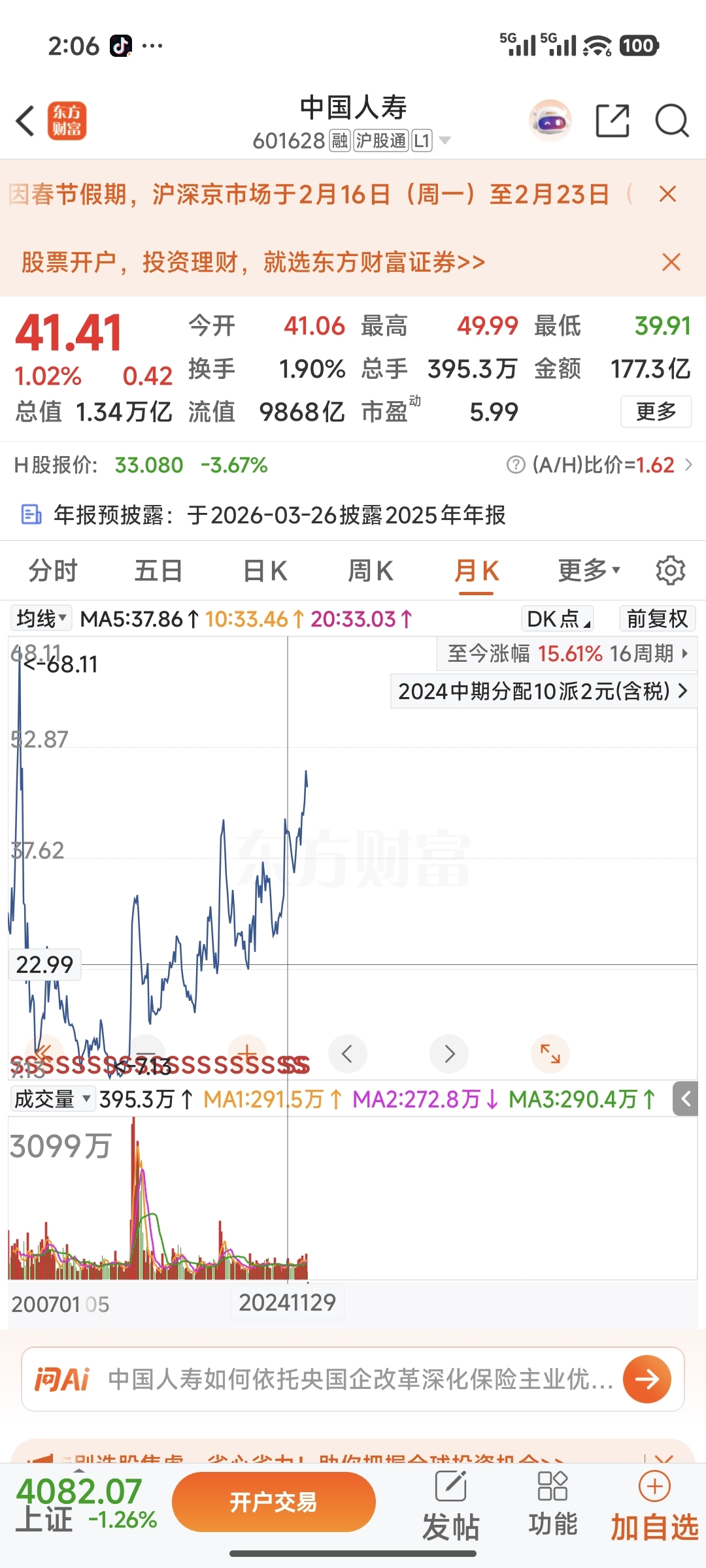 $中国人寿(SH601628)$ 为啥这个月线图看着现在的股价已经超过2024年的高点了?