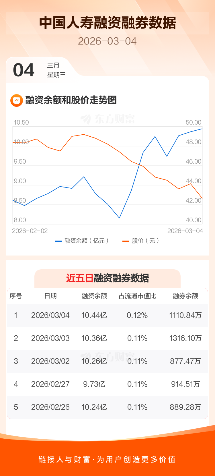 交易所最新数据显示,中国人寿于2026年3月4日获融资买入1.20亿元,融资偿还1.12亿元,当日融资净买入786.58万元。目前,该股融资余额10.44亿,占流通市值比例为0.12%。
