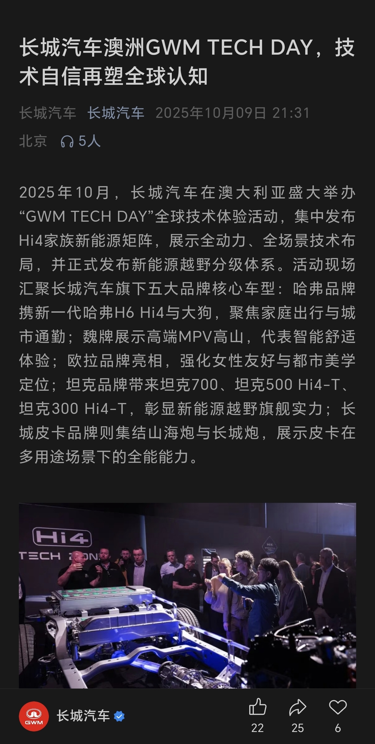 $长城汽车(SH601633)$ 社会需要这种能够走出去的全球化汽车品牌,反观国内有些车厂,吹牛笔,玩心眼子营销没有底线