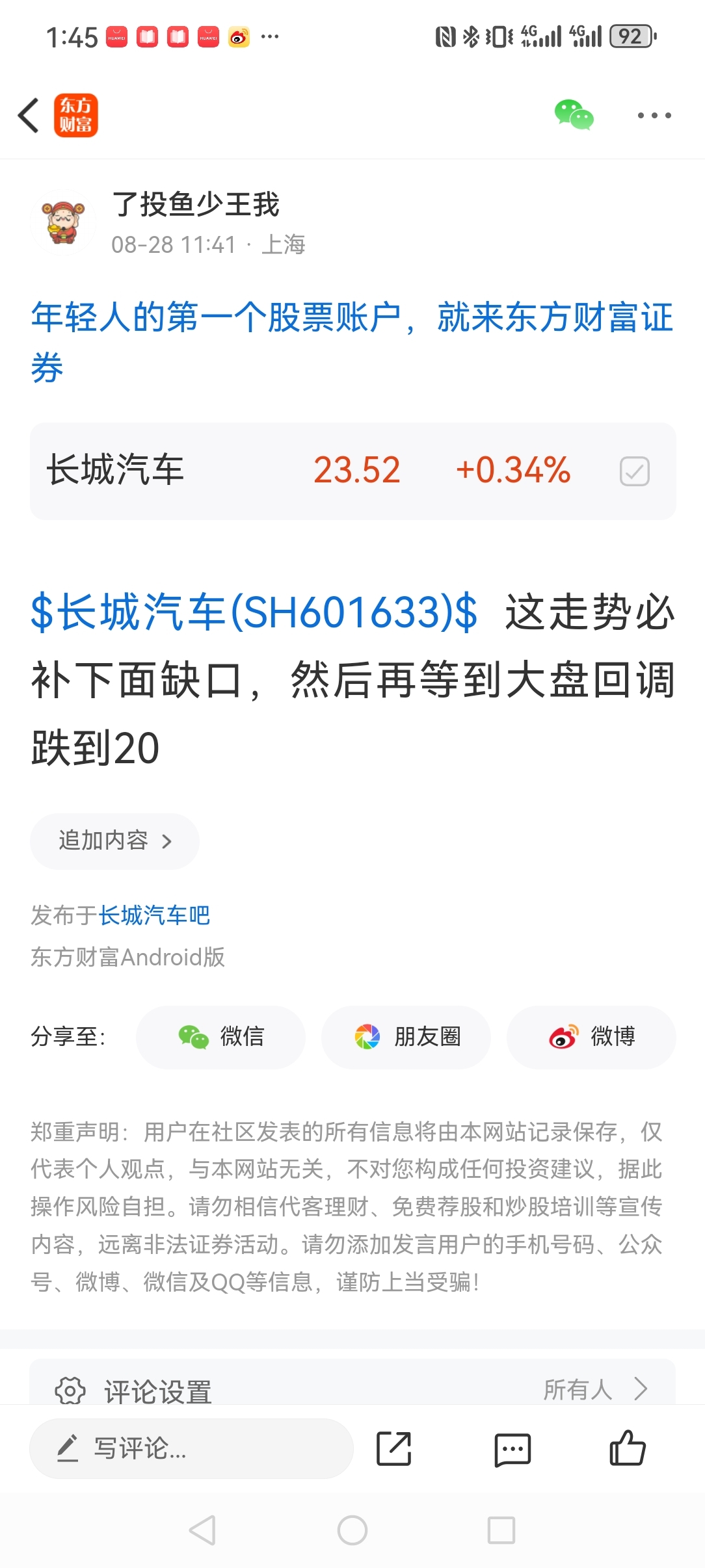 温馨提示: 1.根据《证券法》规定,禁止编造、传播虚假信息或者误导性信息,扰乱证券市场;2.用户在本社区发表的所有资料、言论等仅代表个人观点,与本网站立场无关,不对您构成任何投资建议。用户应基于自己的独立判断,自行决定证券投资并承担相应风险。《东方财富社区管理规定》