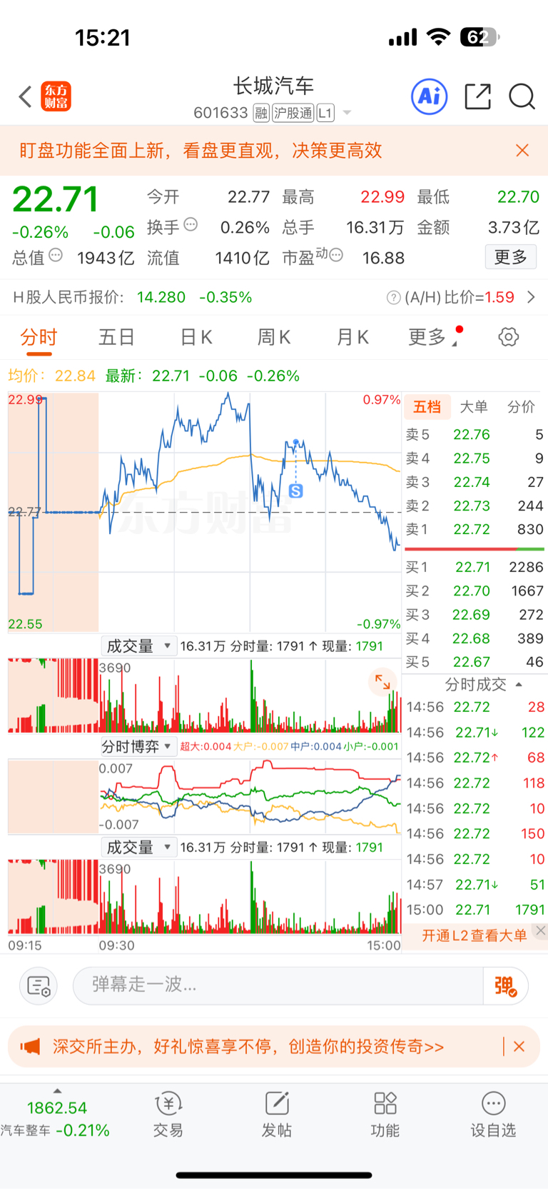 $长城汽车(SH601633)$ 赚两百跑路了