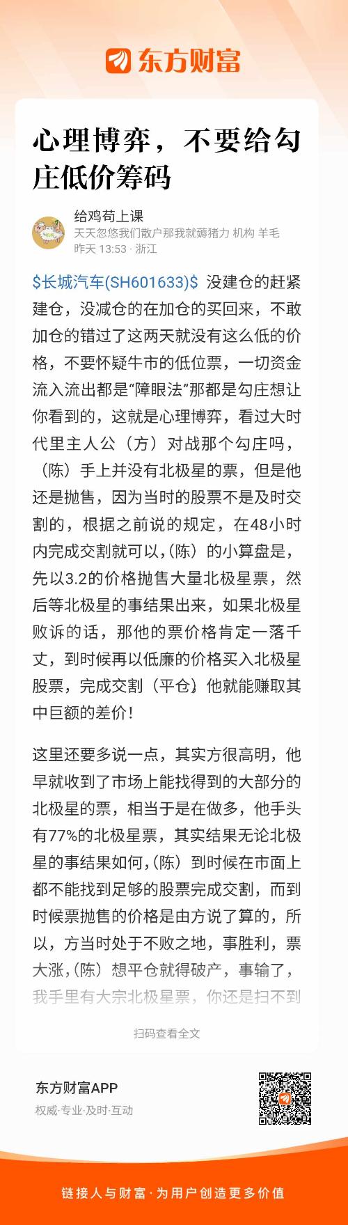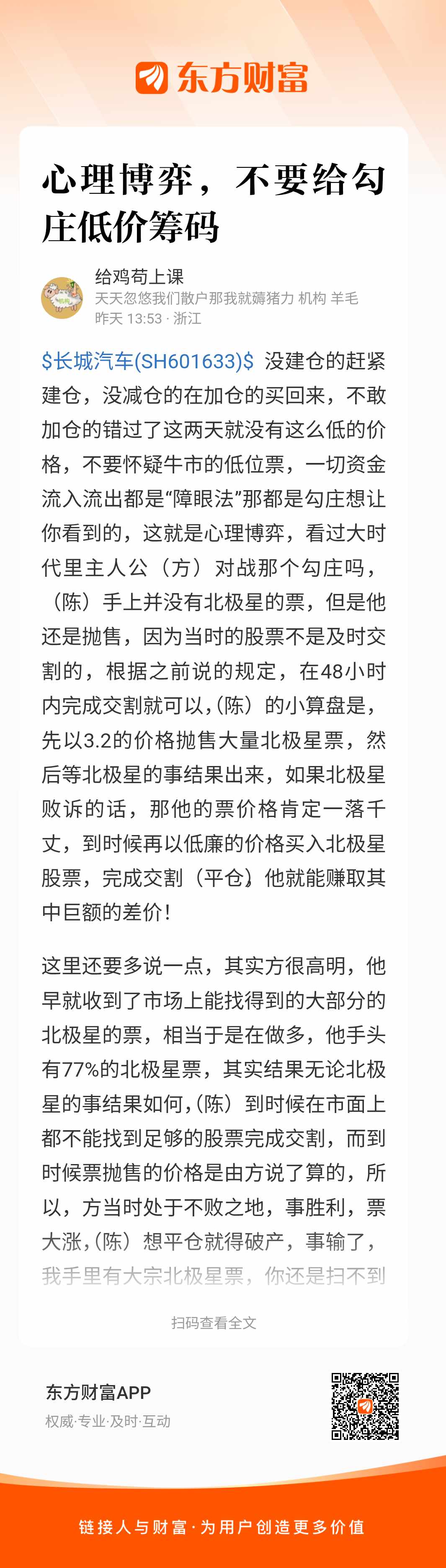 $长城汽车(SH601633)$ 没建仓的赶紧建仓,没减仓的在加仓的买回来,不敢加仓的错过了这两天就没有这么低的价格,不要怀疑牛市的低位票,一切资金流入流出都是“障眼法”那都是勾庄想让你看到的,这就是心理博弈,看过大时代里主人公(方)对战那个勾庄吗,(陈)手上并没有北极星的票,但是他还是抛售,因为当时的股票不是及时交割的,根据之前说的规定,在48小时内完成交割就可以,(陈)的小算盘是,先以3.2的价格抛售大量北极星票,然后等北极星的事结果出来,如果北极星败诉的话,那他的票价格肯定一落千丈,到时候再以低廉的价格买入北极星股票,完成交割(平仓),他就能赚取其中巨额的差价!